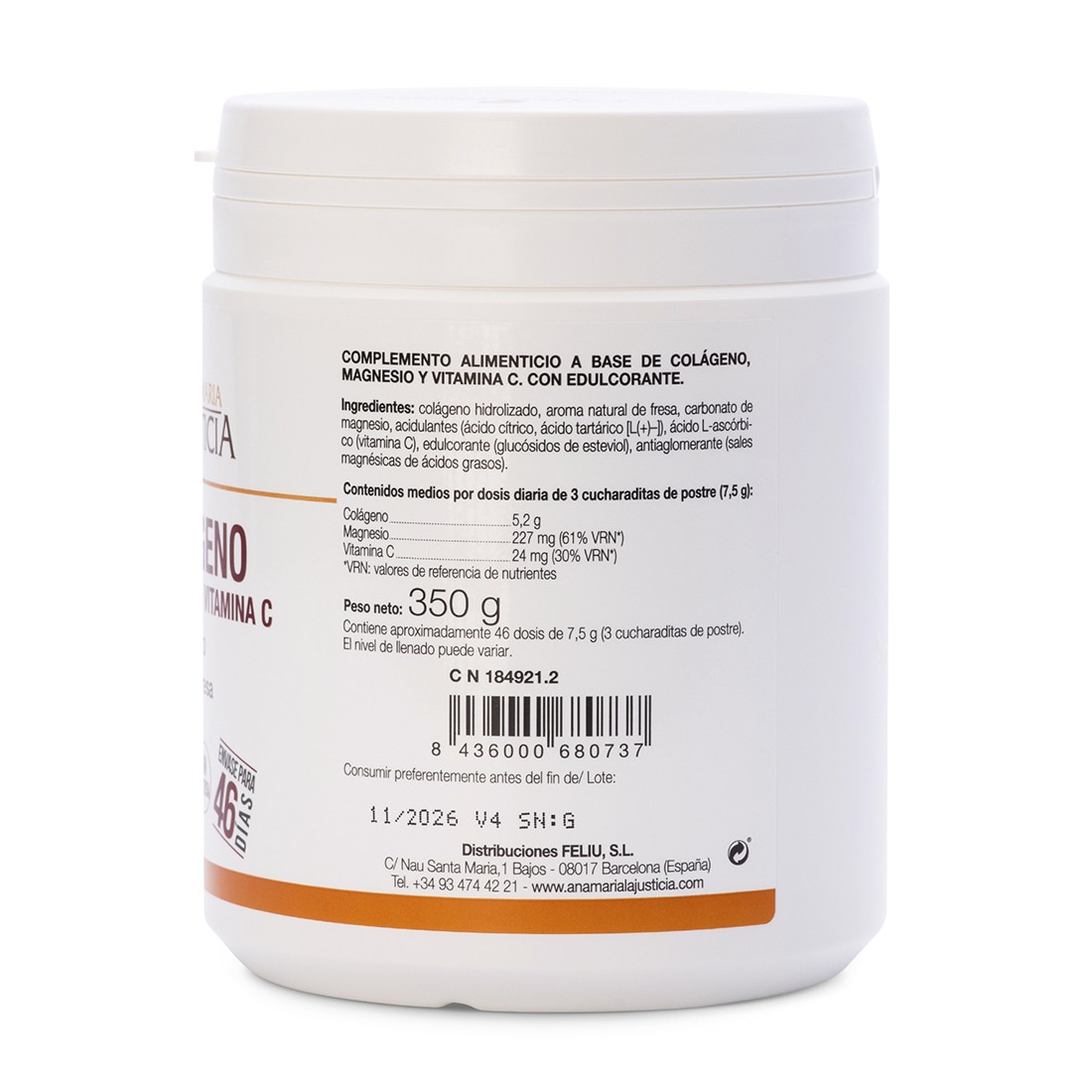 Average content per daily dose of 3 dessert teaspoons (7.5 g): Hydrolysed Collagen 5.2 g, Magnesium 227 mg (61% NRV*) and Vitamin C 24 mg (30% NRV*).