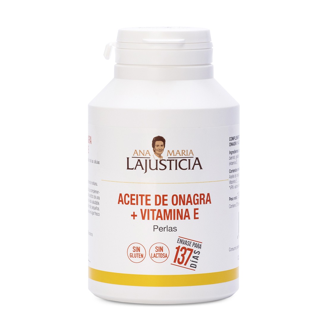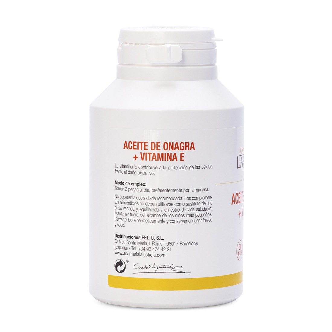 Dietary supplement with Evening Primrose oil, rich in vitamin E and polyunsaturated fatty acids. Vitamin E contributes to protecting cells against oxidative damage.